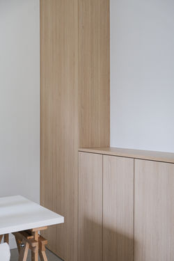 Ontwerp en inrichting van nieuwbouw te Putte. Op de gelijkvloers werd er een bureauruimte gecreëerd in de leefruimte door middel van glazen wanden die open en dicht geschoven kunnen worden. Een Harmonica systeem. Een wand met haard en tv zorgt voor een gezellige tv-hoek. Boven op het eerste verdiep werd de volledige badkamer voorzien in mortex.