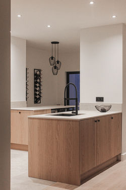 Renovatie van gelijkvloers, de keuken werd een volledig open keuken met eik, zwart, smeedijzeren deuren, natuurlijke tinten.