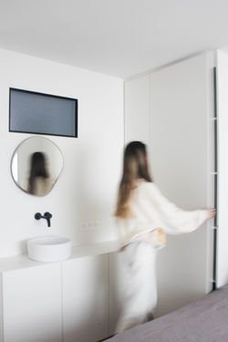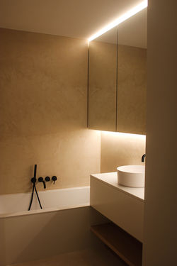 Dit appartement in Oostduinkerke benadrukt een harmonieuze verbinding met de omgeving. De natuurlijke tinten van de zee en het strand worden doorgetrokken in de keuze van materialen en kleuren, wat zorgt voor een rustige en tijdloze sfeer. Hier zijn enkele kernpunten van het project. De bestaande keuken is behouden, maar vernieuwd met een eigentijds werkblad, moderne huishoudtoestellen en vernieuwde kastfronten. Dit geeft de keuken een frisse uitstraling zonder de structuur volledig te veranderen. De gebruikte materialen weerspiegelen de natuurlijke elementen van de kust, zoals zandkleuren, zachte blauwtinten en houtachtige texturen, waardoor het appartement een serene en organische uitstraling krijgt. In de slaapkamers en andere ruimtes ligt de nadruk op functionaliteit, waarbij er ook aandacht is besteed aan het creëren van optimale opbergruimte. Dit maximaliseert het gebruik van de ruimte zonder concessies te doen aan esthetiek.